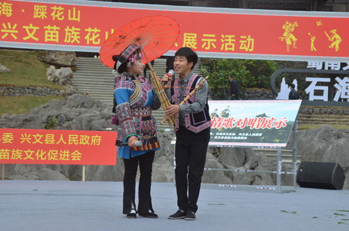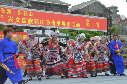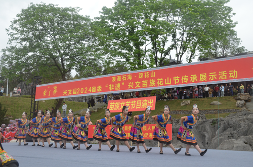 4月22日上午10时,以“浪漫石海·踩花山”为主题的“2024年四川·兴文苗族花山节”正式开幕。在开幕式上,举行了《四川省铸牢中华民族共同体意识研究基地兴文县分基地》授牌仪式、县委书记、县长周明军在开幕式上作了热情洋溢的致辞,宜宾市政协副主席王宾宣布:“2024年四川·兴文苗族花山节”开幕,随后开展了《笙动兴文》《浪漫石海》《鼓舞中国》实景节目表演。