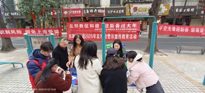 为认真贯彻落实中央和省委、市委、区委反邪教工作部署要求,深入推进反邪教警示宣传教育,筑牢全社会反邪教思想防线和行动自觉,维护春节期间辖区政治安全和社会稳定,2025年1月22日上午,成都市青羊区反邪教协会联合青羊区西御河街道办事处在光明巷开展“反邪教促和谐,迎新春过大年”为主题的2025年春节期间反邪教警示宣传教育活动,同时还开展了禁毒和防诈骗宣传活动。