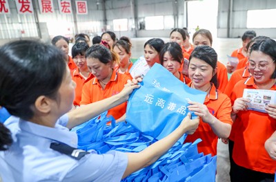 2025年6月23日,四川省华蓥市华蓥山经开区大千电子厂的务工人员,在领取禁毒志愿者发放的装有禁毒宣传资料等物品的“法治大礼包”。