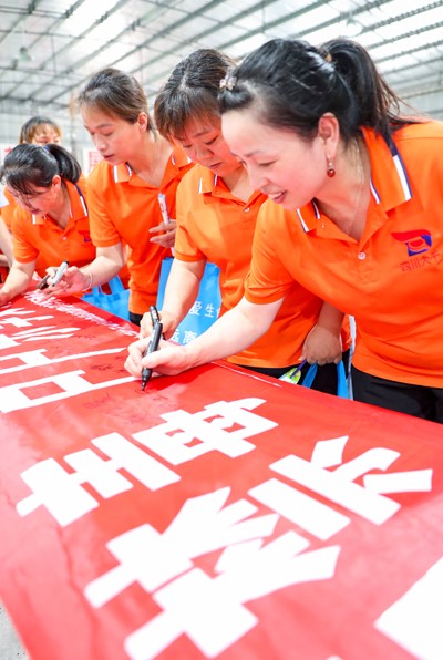 2025年6月23日,四川省华蓥市华蓥山经开区大千电子厂的务工人员,在写有“人人参与禁毒”等字样的横幅上签字。