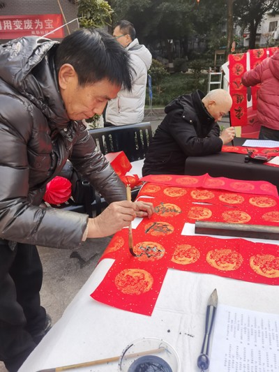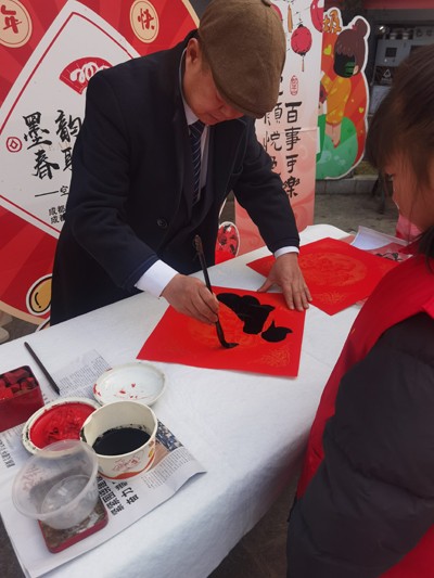 上午九时许活动拉开序幕,黄甲街道诗词楹联分会会长付仕水、会员廖白石、李连坤、白南顺及王树根五位老师铺开书写阵势,此时广大群众围了过来纷纷向老师们索要春联和福字,短短两个小时的活动老师们就送出了春联和福字200余副,深受广大群众的欢迎,住在空港新区的张婆婆领到春联后激动的说:“你们写得好,谢谢你们!你们辛苦了!我拿回去贴起就有了过年的喜庆和味道安逸”!(付仕水/文图)