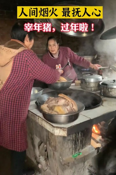 猪肉收拾妥当后,主人家就开始准备请客的饭菜。厨房里,女人们忙碌起来。切肉、配菜、生火,有条不紊地进行着。猪肉的做法多种多样,最受欢迎的当属回锅肉和炖猪蹄。