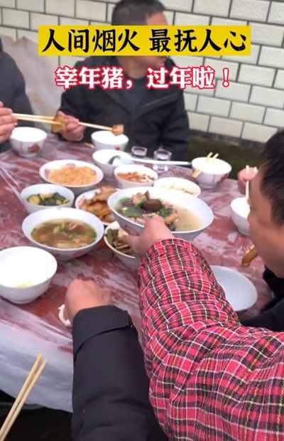 在四川武胜,杀猪不仅仅是一种过年的传统习俗,更是一次亲朋好友的团聚,是对一年辛勤劳作的犒赏,也是对新的一年美好生活的祈愿。这一顿猪肉宴,吃的是美味,品的是亲情和乡情,承载的是浓浓的年味和对家乡深深的眷恋 。(廖正英/摄影报道)