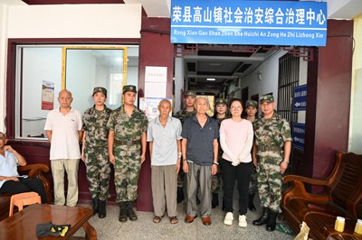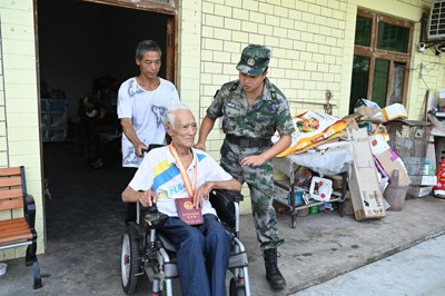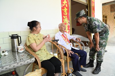 家住荣县高山镇红观音村的98岁抗战老兵范志华,听说退役军人志愿服务队的“战友”们要来看望他,早早的把抗战胜利80周年的纪念章佩戴在胸前,看到身着迷彩服的服务队队员走进院坝时,坐在轮椅上的他一个劲的挥手迎接。