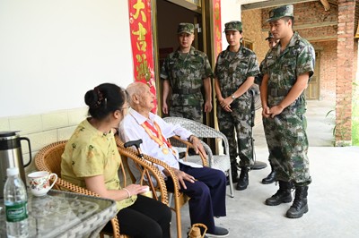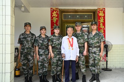 范志华曾是中国军史上第一支伞兵部队的伞兵,曾在缅甸和广东等地参加过抗日作战,经历过大大小小多次战役。如今,6名子女轮流照料他和93岁的老伴。队员们围在他身边,聆听他讲述曾经的烽火硝烟。