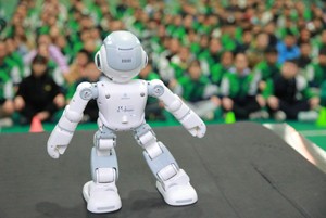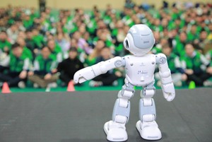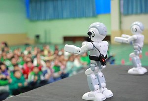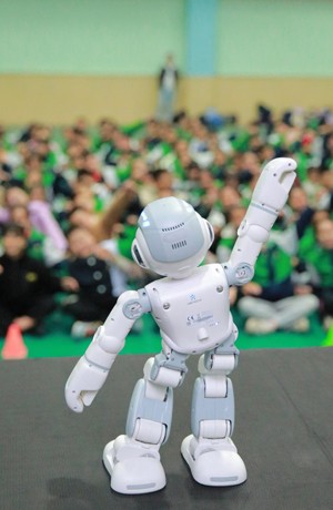 2023年11月13日,机器人在四川省华蓥市双河小学为学生跳舞。