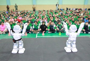 2023年11月13日,四川省华蓥市双河小学学生与机器人一起做动作。