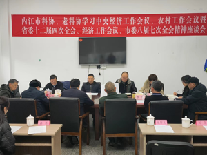 12月28日,内江市老科协召开学习中央经济工作会议、农村工作会议暨省委十二届四次全会、经济工作会议、市委八届七次全会精神座谈会。参加会议的有市老科协会长龚洪贵,市老科协副会长、秘书长、副秘书长、办公室主任、副主任、各专委会主任、副主任、部分老专家,市科协党组书记高宏、副主席刘书平到会指导。