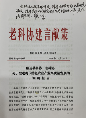 2023年12月28日,威远县委副书记、县长罗侯勇在县科协、县老科协呈送的《关于推进现代特色农业产业高质量发展的调研报告》上作出批示:“老科协的报告很详实,请县农业农村局认真研究吸收,提升威远现代特色农业发展能级和水平。送张涛同志阅。”