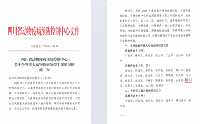 近日,筠连县收到四川省动物疫病预防控制中心2024年12月31日印发的《关于全省重大动物疫病防控工作情况的通报》(川疫控发〔2024〕131号),四川省动物疫病预防控制中心通报了2024年度全省非洲猪瘟等重大动物疫病防控、布病等人畜共患病防控工作、动物疫病监测流调净化工作成效突出市(州)、县(市、区)名单,其中宜宾市筠连县获非洲猪瘟等重大动物疫病防控工作成效突出县,为宜宾市唯一。