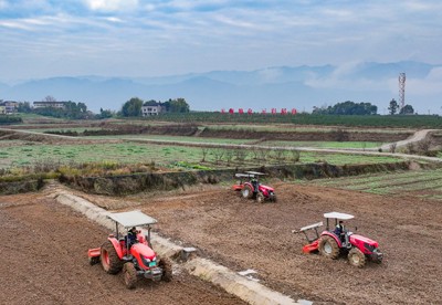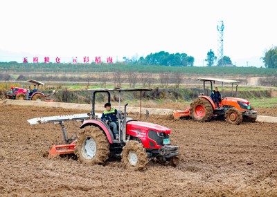 2025年2月3日,四川省华蓥市华龙街道东方村的农民在田间给“犁春牛”的“铁牛”佩戴大红花,准备动土翻耕农田迎接“立春”。(邱海鹰 刘南贤/摄影报道)