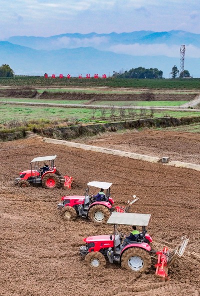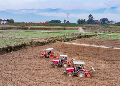 2025年2月3日,四川省华蓥市华龙街道东方村的农民驾着“铁牛”在田间“犁春牛”,动土翻耕农田迎接“立春”。
