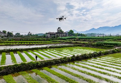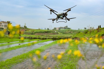 2025年4月9日,四川省广安市盛世农业有限责任公司华蓥市华龙街道沙坝村粮油基地的工作人员,利用无人机给即将移栽的秧苗喷洒杀虫剂。