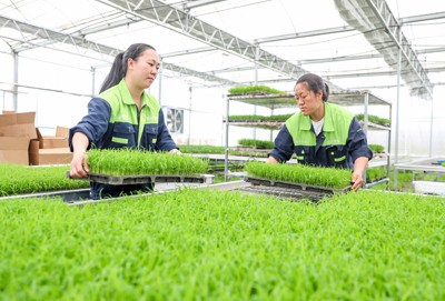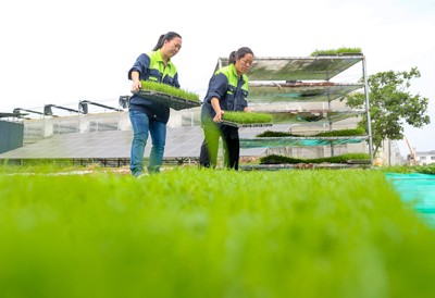 2025年4月9日,四川省广安市盛世农业有限责任公司邻水县袁市镇粮油基地的工作人员,在育秧中心给即将移栽的秧苗炼苗。(邱海鹰/文图)