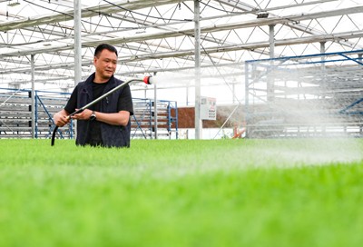 2025年4月9日,四川省广安市盛世农业有限责任公司邻水县袁市镇粮油基地的工作人员,在育秧中心给即将移栽的秧苗浇水。